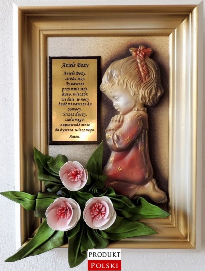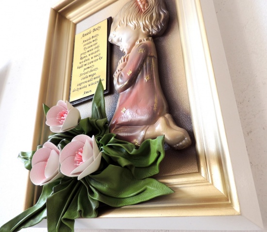 Do zaoferowania posiadam... oryginalny obraz ze skóry z modlącą się dziewczynką, wygrawerowaną dedykacją i kwiatami